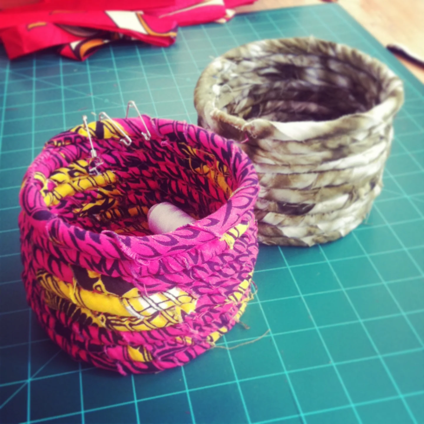 The first new product we're working on is baskets / pots made from coiled rope wrapped in fabric strips and hand-sewn together. They picked up the process so quickly! Everyone has finished at least one already, so their weekend homework assignment is to have 2 new ones completed by Monday. They actually liked having homework, so I didn't feel too badly about playing that teacher card.